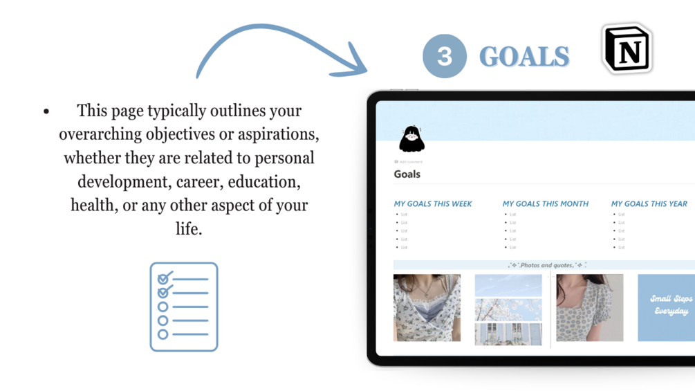 It includes 7 pages organized on one dashboard space: Goals page, Monthly planner, Journal, Wishlist, Weekly plans, Study, Favourite things.